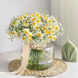 دسته گل خوش عطر و بوی نرگس و ژیپسوفیلا با عشق تزیین شده در گلدان شیشه ای هلندی. گل نرگس قشنگترین و پرطرفدارترین گلی است که میتوانید به عزیزانتان هدیه دهید.